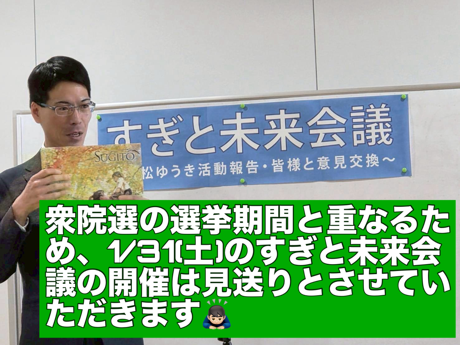 つきまして、1/31(土) 開催予定のすぎと未来会議は、衆院選の選挙期間と重なるため、今回の開催を見送りと判断させていただきました。